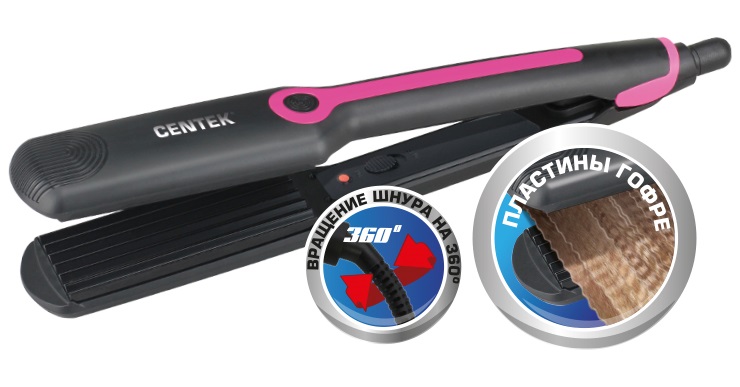 Щипцы для завивки волос Centek CT-2015 с пластинами в форме гофре оснащены керамическим покрытием, которое позволит вам навсегда забыть об использовании средств для защиты волос от воздействия высоких температур. Максимальная рабочая температура модели Centek CT-2015 равна 230 градусам – до этого показателя щипцы нагреваются всего за 2 минуты.